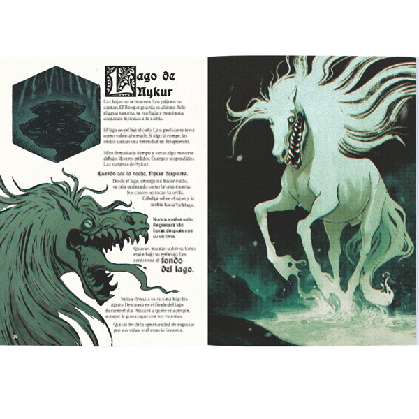 El suplemento está estructurado para inspirar y facilitar la gestión de la partida. Las ilustraciones de Tania Herrero no son meros adornos; son ventanas evocadoras diseñadas para ayudarte a describir el horror del Bosque a tus jugadores.
