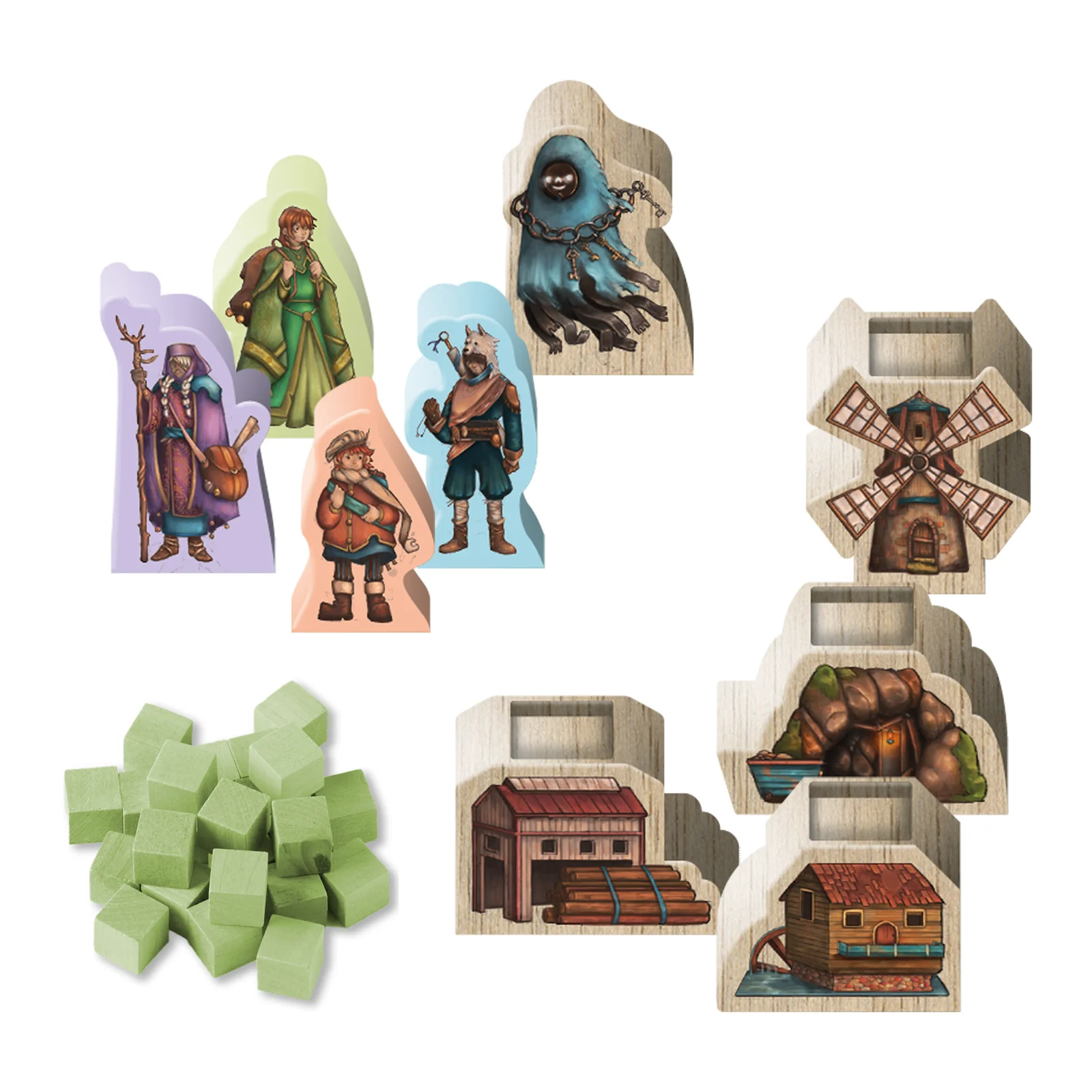 Haunted Lands ofrece una experiencia rica gracias a su amplio conjunto de componentes: 64 cubos de perceptor, 25 espectros, 12 molinos, 12 minas, 12 norias, 32 cartas de tarea, fichas de recursos, dados de terreno y recompensa, losetas de región, tableros individuales y un tablero principal. Cada elemento está diseñado para sumergirte aún más en la historia del juego y ofrecer múltiples estrategias de victoria.