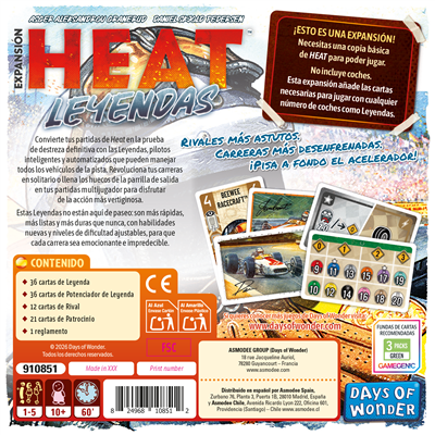 Esta expansión no incluye coches, pero añade todas las cartas necesarias para utilizar cualquier número de vehículos como Leyendas. Es importante destacar que Heat: Leyendas requiere una copia del juego base Heat para poder jugar.