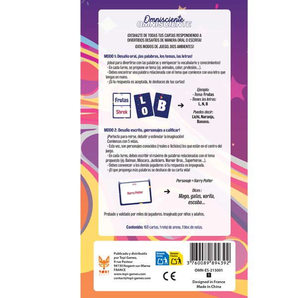 Omnisciente es un dinámico juego de cartas para 2 a 8 jugadores que combina aprendizaje, debate y diversión. Con dos modos de juego distintos —oral y escrito— es perfecto para estimular el vocabulario, el pensamiento rápido y la imaginación. Ideal para jugadores a partir de los 10 años, sus partidas rápidas de solo 15 minutos lo convierten en un excelente juego para animar cualquier reunión.