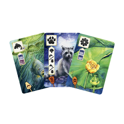 1 tablero de río a doble cara, 55 cartas de río, 4 cartas de dique de castor, 4 cartas de atardecer, 4 cartas de terreno inicial, 3 cartas del mazo W, 3 cartas del mazo E, 3 cartas del mazo N, 3 cartas del mazo S, 6 cartas de juego en solitario, 1 ficha de objetivo, 4 fichas de ruta de río, 2 fichas de cascada, 4 fichas de bonificación, 8 fichas de sendero, 6 fichas de muelle, 6 fichas de tienda de campaña, 1 sobre con 6 cartas adicionales, 4 peones de kayakista, 1 portacartas plegable, 1 reglamento con un índice de cartas