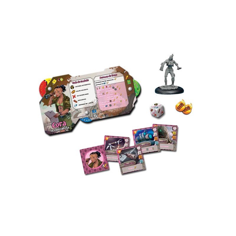 1 tablero de personaje, 12 cartas de Objeto, 1 dado de Combate, 2 fichas de Detonantes, 1 miniatura de Cora.